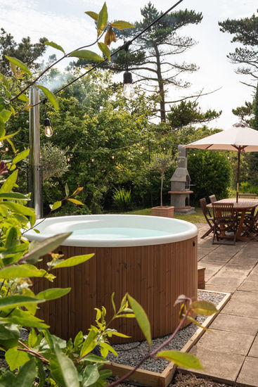 Patio door in lounge/kitchen area leads out onto garden with large patio with wood-fired hot tub, BBQ, and table and chairs to seat 6 with parasol.
