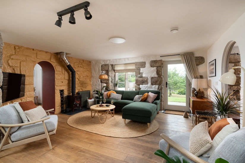 Open plan lounge, kitchen and dining area with woodburner, large sofa and chairs to seat 6 and TV.